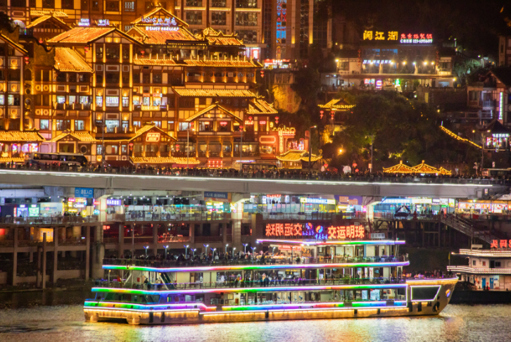 ▲12月21日晚,重庆两江四岸灯火璀璨,乘坐两江游轮的市民游客络绎不绝。特约摄影 孙凯芳 摄/视觉重庆