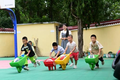 ▲9月3日,重庆市酉阳土家族苗族自治县板桥乡水车坝小学,涂娅带着学生在操场做游戏。通讯员 冉川 摄