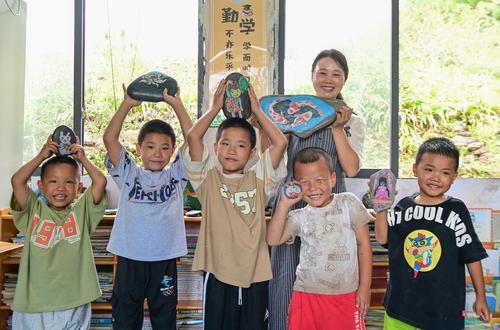 ▲9月3日,重庆市酉阳土家族苗族自治县板桥乡水车坝小学,涂娅和学生们展示上学期完成的石头画作品。通讯员 冉川 摄