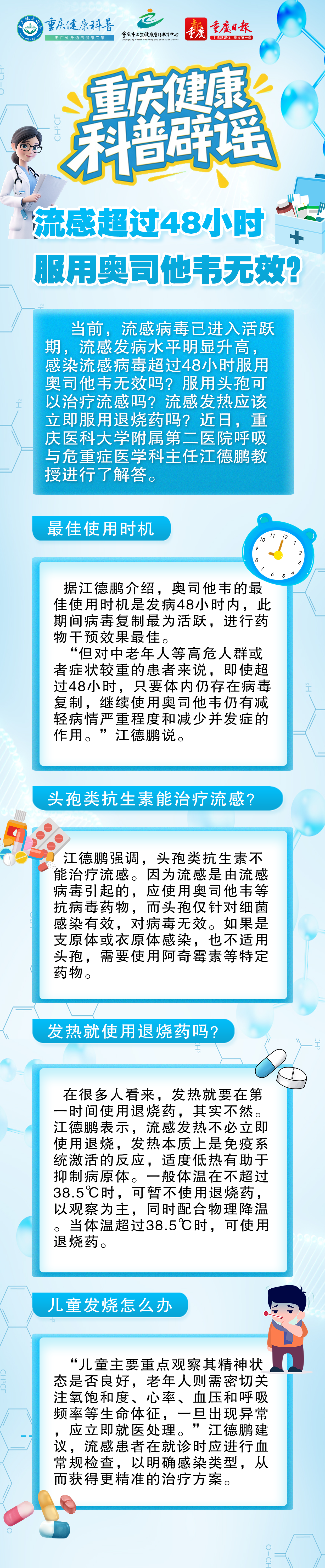 当前,流感病毒已进入活跃期,流感发病水平明显升高,感染流感病毒超过48小时服用奥司他韦无效吗?服用头孢可以治疗流感吗?流感发热应该立即服用退烧药吗?对此,重庆医科大学附属第二医院呼吸与危重症医学科主任江德鹏教授进行了解答。