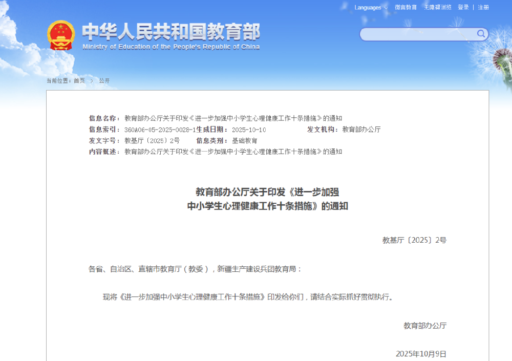 近日,教育部印发通知,出台《进一步加强中小学生心理健康工作十条措施》(以下简称《措施》)。消息一经发布,迅速引发舆论关注。