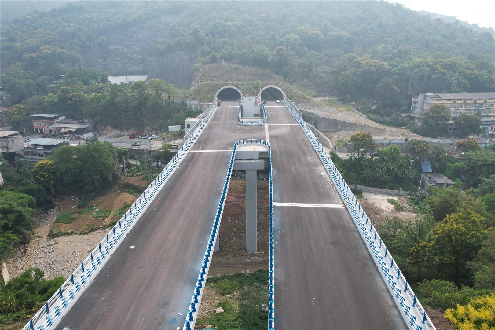 新燕尾山隧道为双向3车道,全长2.5公里,目前已完成建设内容;桥梁全长246米,已完成栏杆安装、附属施工等;主线道路全长254米,正在铺设沥青。