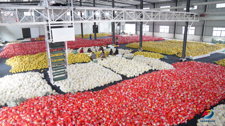 采摘季的三元镇红心柚储藏加工集散中心一片忙碌,自动化清洗、分级设备正将柚子按大小、色泽精准分类。