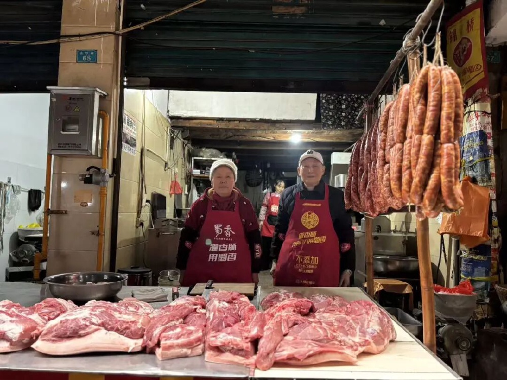 在周婆婆香肠加工店铺,周婆婆和老伴李还金正忙着为顾客挑选香肠、称重打包,女儿李红则在一旁协助。
