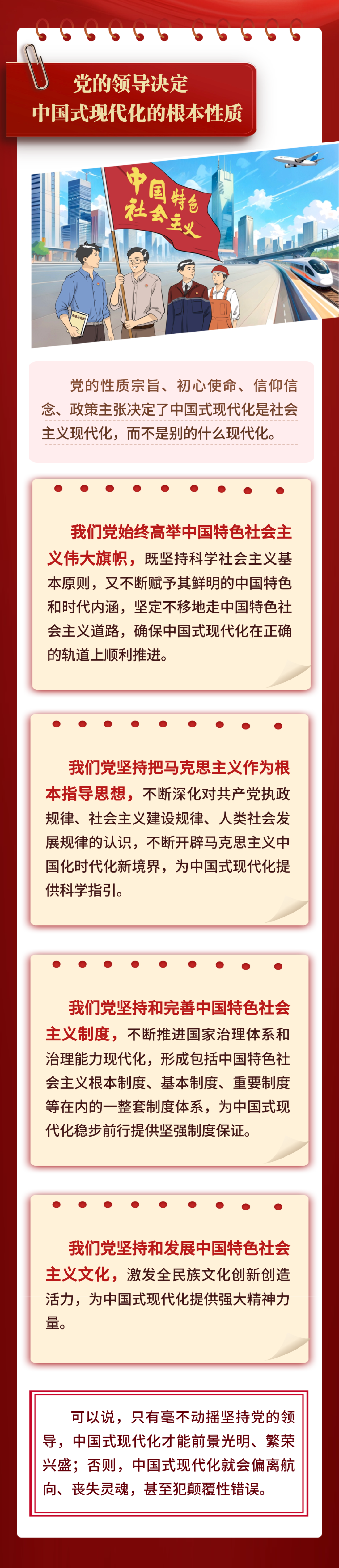 党的二十大报告明确指出:“中国式现代化,是中国共产党领导的社会主义现代化”。这是对中国式现代化定性的话,是管总、管根本的。为什么要强调党在中国式现代化建设中的领导地位?这是因为,党的领导直接关系中国式现代化的根本方向、前途命运、最终成败。