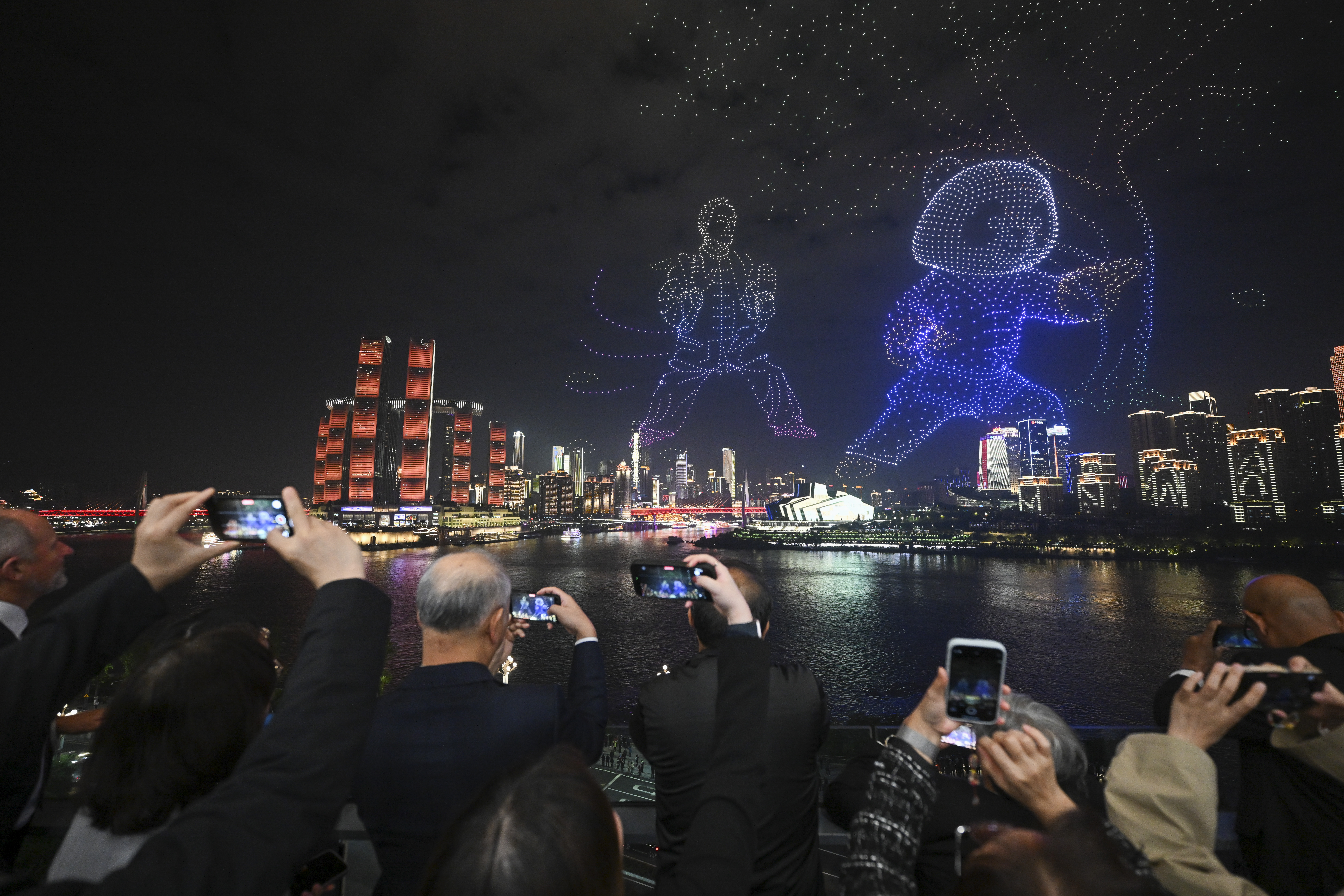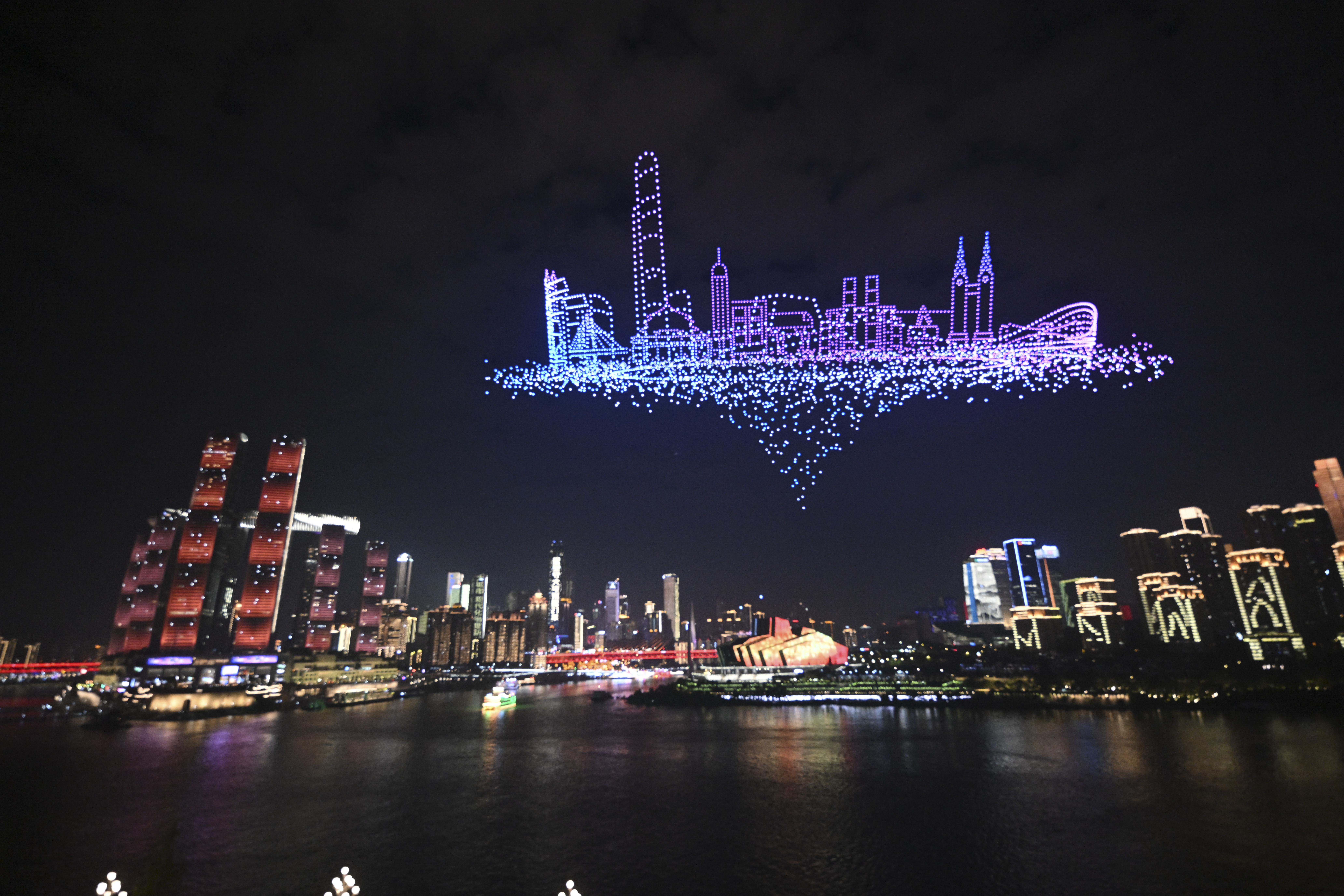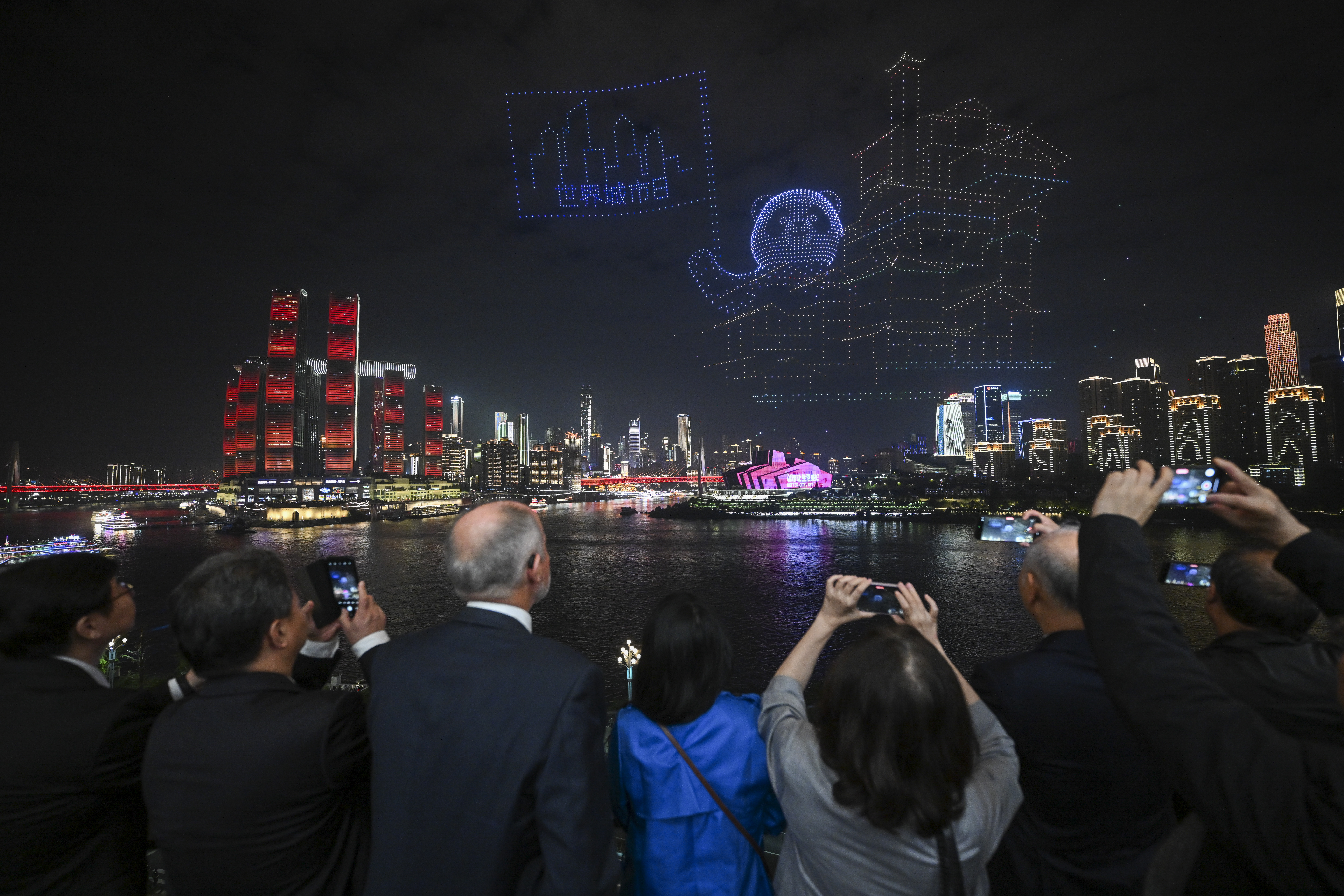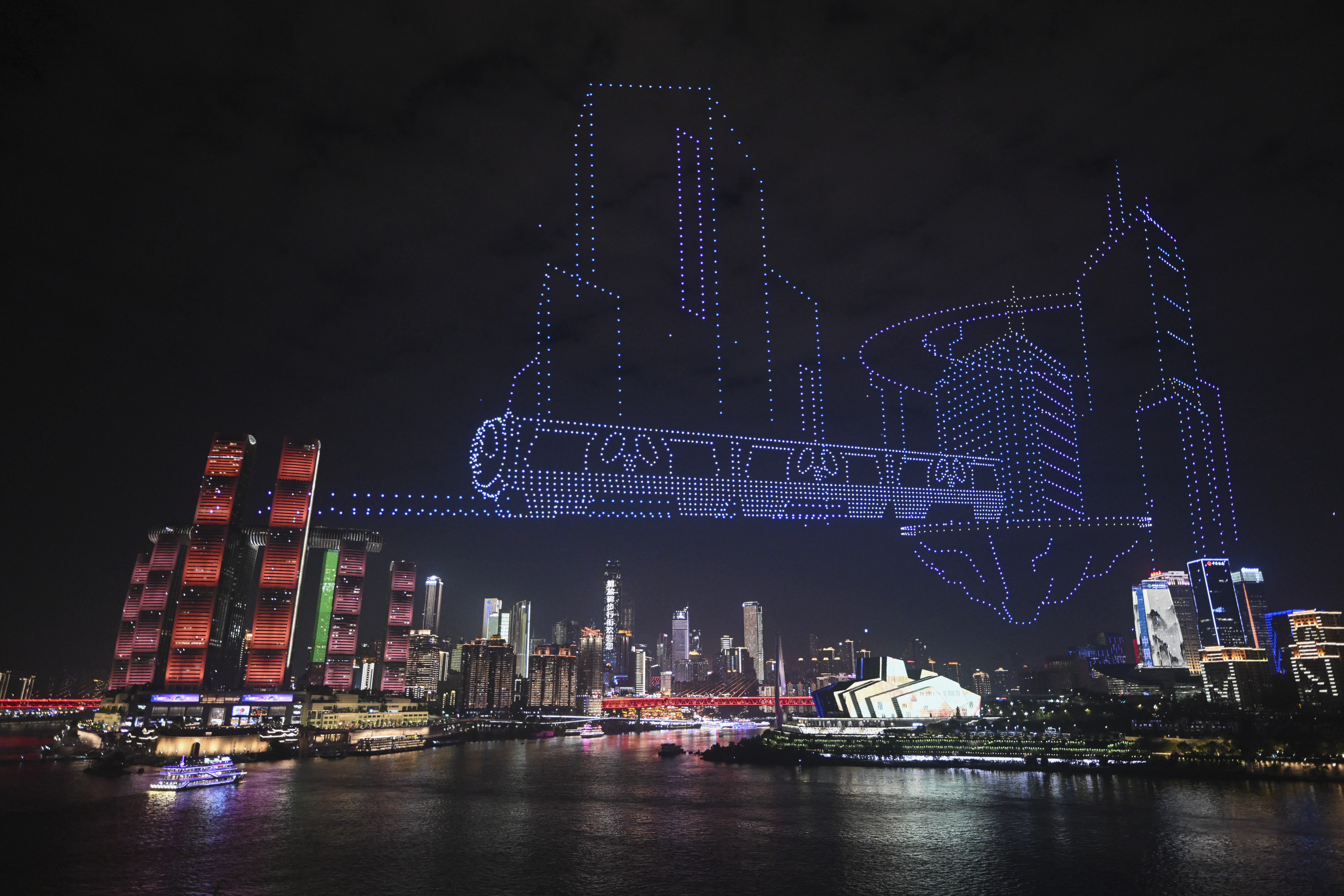 10月27日晚,重庆两江交汇的夜空被数千架无人机点亮。当晚,“新韵重庆”无人机灯光秀带来了一场以“人民城市 智绘未来”为主题的专场展演,本次展演以大熊猫作为主角,通过拟人化的创意形式,向中外嘉宾生动呈现重庆作为创新之城、宜居之城、美丽之城、韧性之城、文明之城与智慧之城的多元形象。