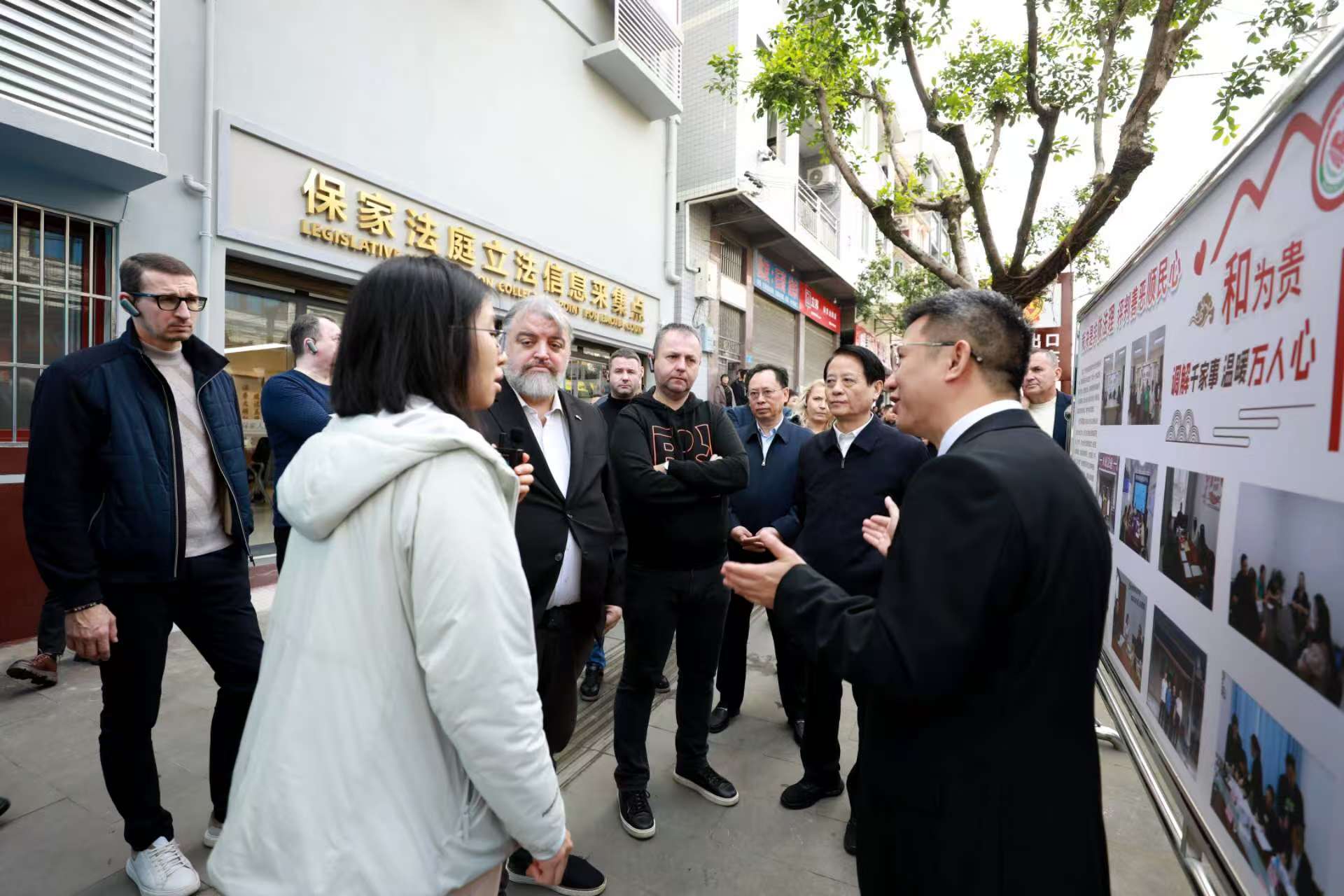 16日,外宾们前往保家基层立法联系点保家法庭立法信息采集点。该基层立法联系点肩负周边5个乡镇14万余群众与国家立法机关之间的沟通任务。保家法庭立法信息采集点自设立以来,参与34部法律法规草案征询,收集700余条意见建议,其中18条被采纳。