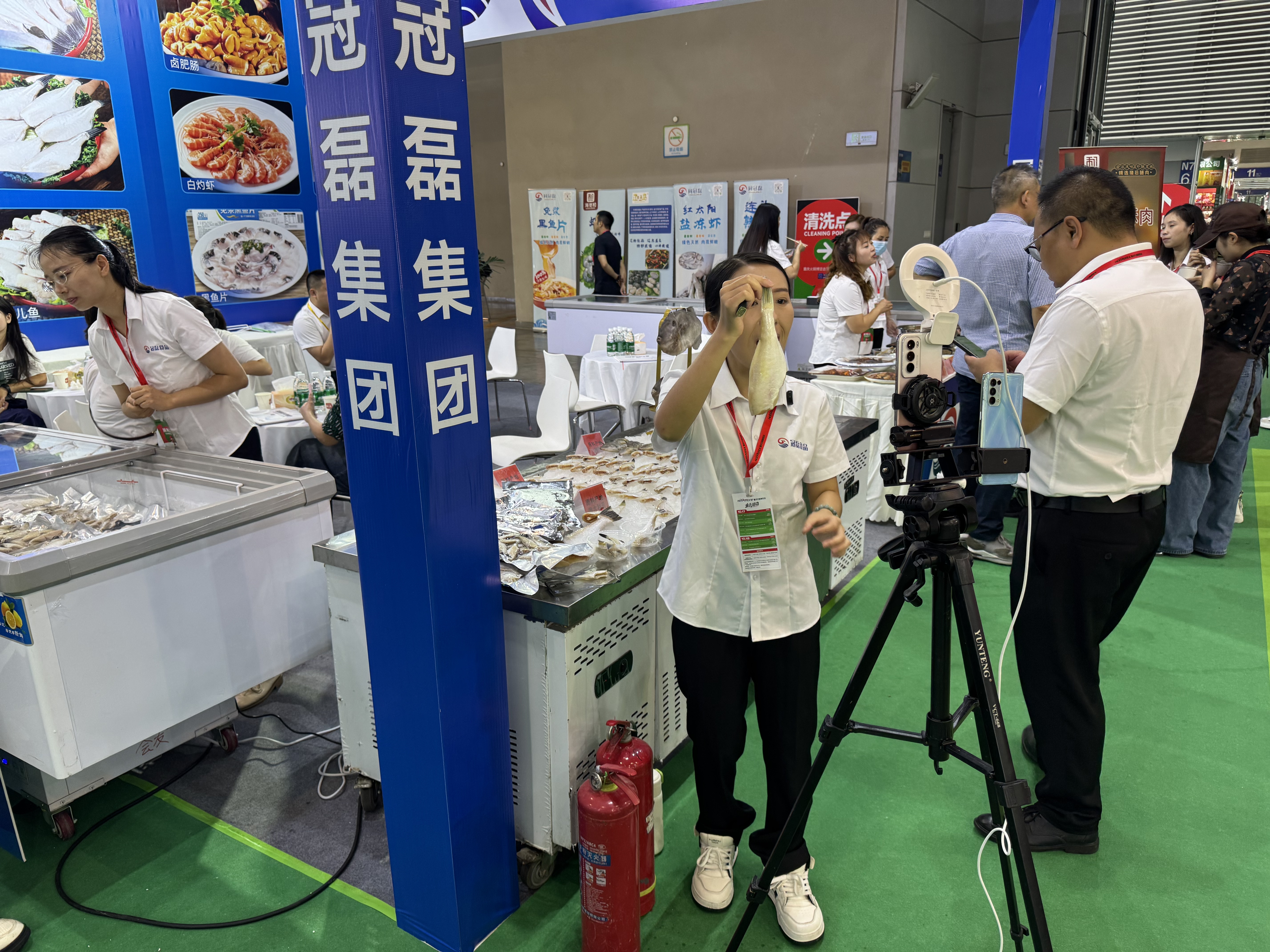 “宝宝们看过来,这是我们今年主打的50厘米长的耗儿鱼,肉质鲜美,特别适合煮火锅,今天直播间有专属优惠!”N7馆内,一位主播正对着屏幕卖力推介。