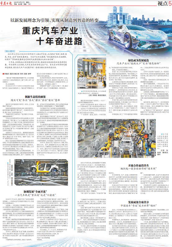 十年来,全国各地以新发展理念为引领,因地制宜推动经济社会高质量发展。作为西部工业重镇,汽车是重庆的重要支柱产业。重庆是如何将新发展理念根植、践行在汽车产业发展中的?请看本报记者的深度采访。