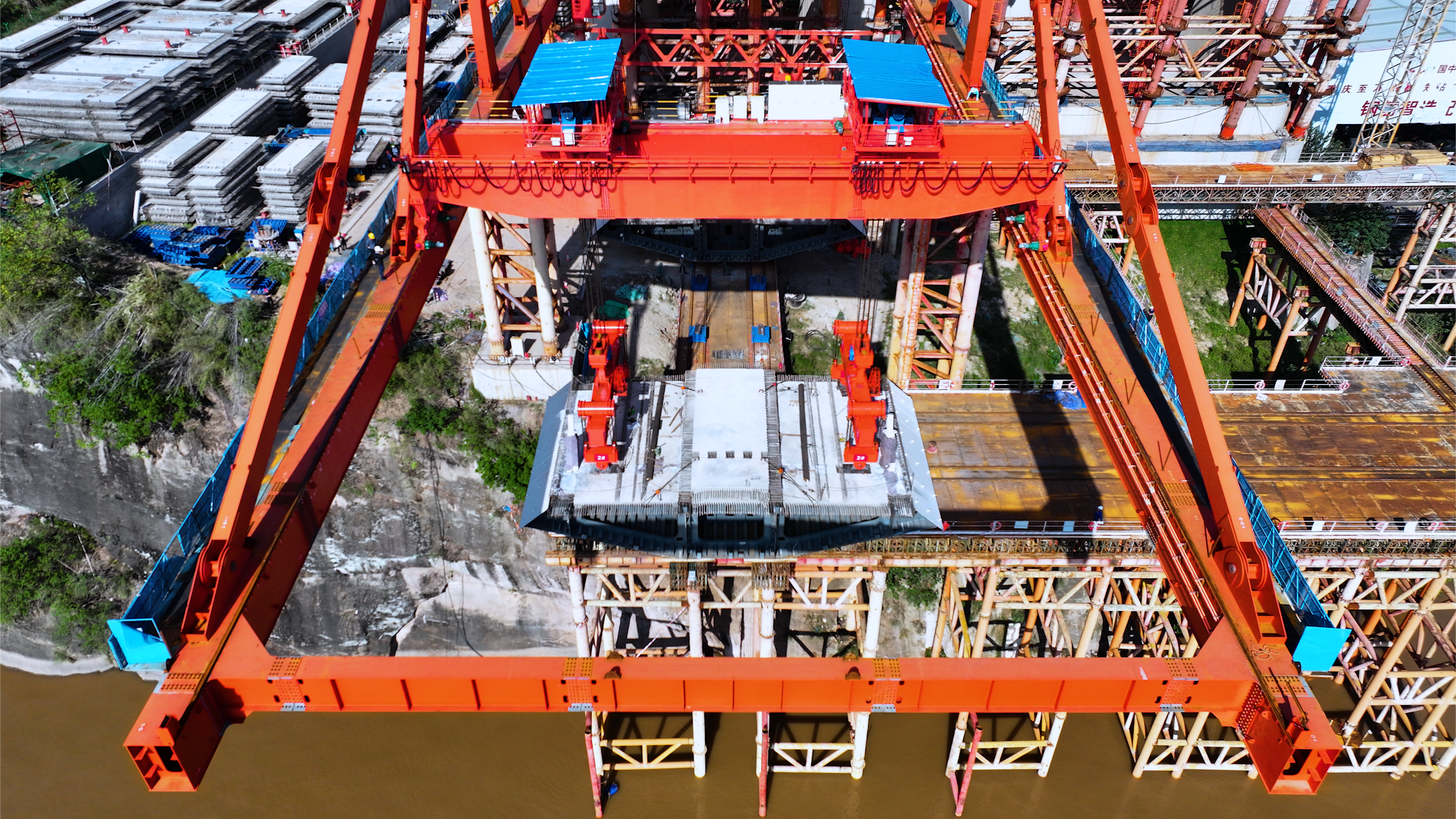大桥位于长江三峡库区,主塔远离主航道,位于水陆交界区域,水位落差大,汛期流速大,受长江季节性水位变化影响强烈,跨越浅滩区的节段钢梁无法直接船运至桥位起吊,项目部通过实地调查,严谨论证,采用“运梁船+码头吊机+滑移支架+架梁吊机”的结合梁转运架设路径,实现复杂条件下结合梁架设工作。