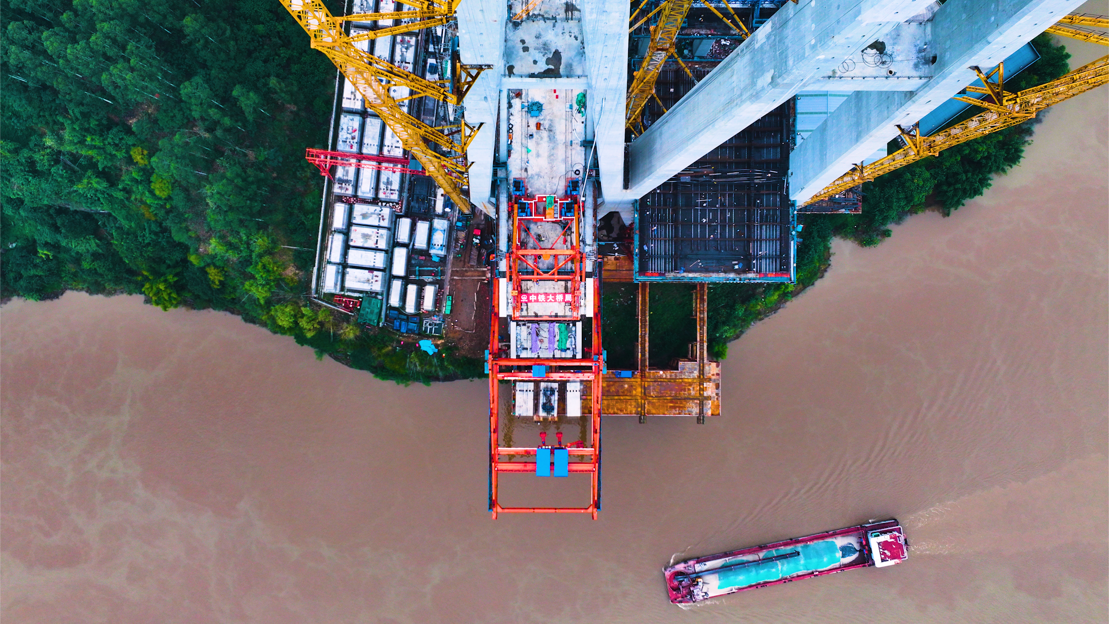 石沱长江大桥位于长江上游中堆水道内,大桥正线长度1416.9米,是渝万高铁项目建设关键节点及控制性工程,有结构新颖复杂、施工组织难度大等特点,大桥建成通车后,将创下四个世界第一:世界首次采用公铁合建双联塔、世界首次采用公铁同层分幅主梁,6#主塔高253米,是世界最高双联主塔;主跨跨度608米,是世界最大公铁合建同层分幅混合梁斜拉桥。