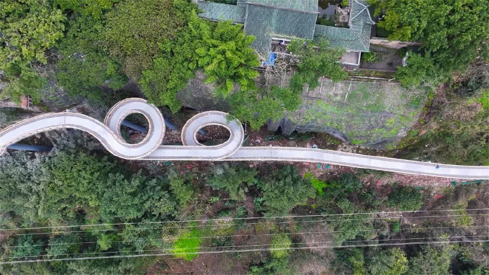 该栈桥依托鹅岭公园北侧天然崖壁地形而建,沿山脊线蜿蜒伸展,将鹅岭公园与佛图关公园有机串联,形成一条视野开阔的观江览城步行通道,从空中俯瞰栈桥如一条轻盈的缎带缠绕于青山之间,与周围茂密的绿植相映成趣,同时为市民提供了观赏李子坝“单轨穿楼”奇观的绝佳视角。