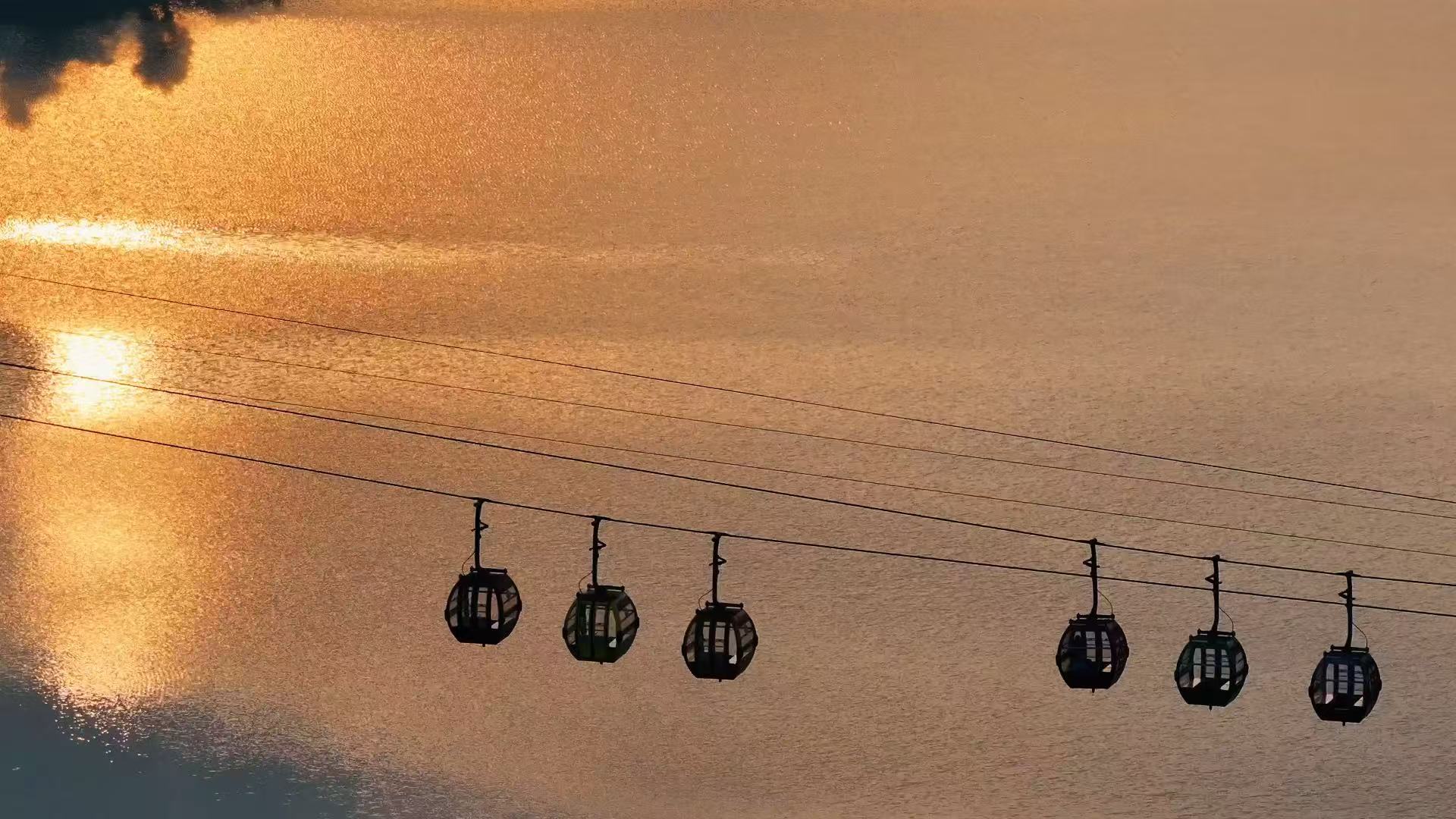 在长江涪陵段支流梨香溪,高水位运行的江面让旁侧的美心红酒小镇景区焕然一新。特别是暮色降临,索道钢索如琴弦般延展,随着索道缆车滑过,置身其中的游客可全方位俯瞰山水人文交融,沉浸式感受“平湖夕照”景致。