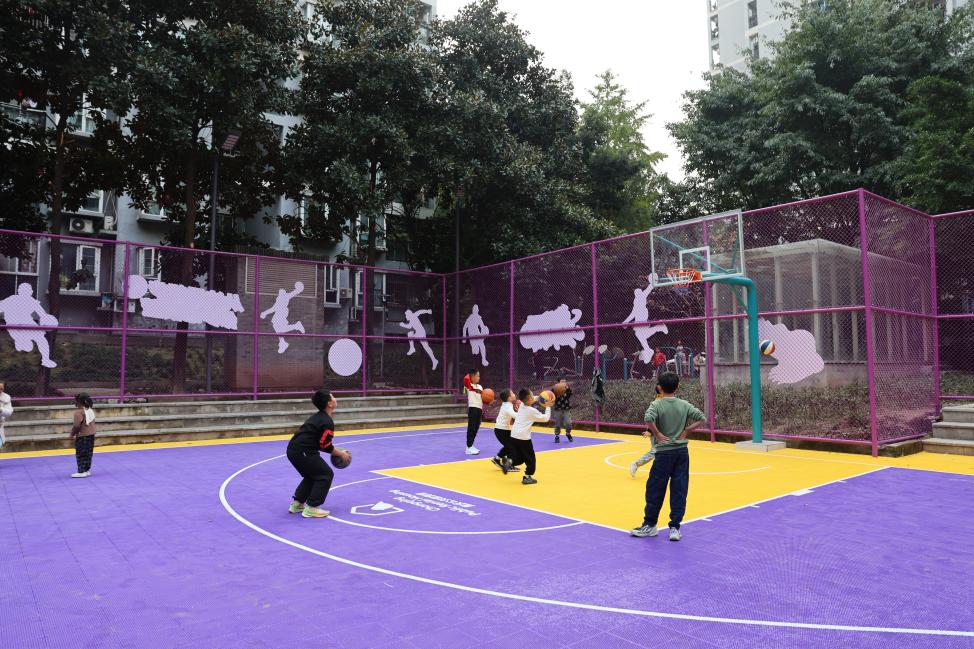 12月1日,初冬的阳光带着暖意洒在民心佳园公租房A组团,新建的篮球场上满是热闹的身影,成了社区里最亮眼的“活力点”。崭新的塑胶地面在阳光下泛着鲜亮的光泽,紫黄相间的时尚配色让整个球场都透着青春气息。篮球场旁,老人们在新增的健身器材上悠然锻炼。