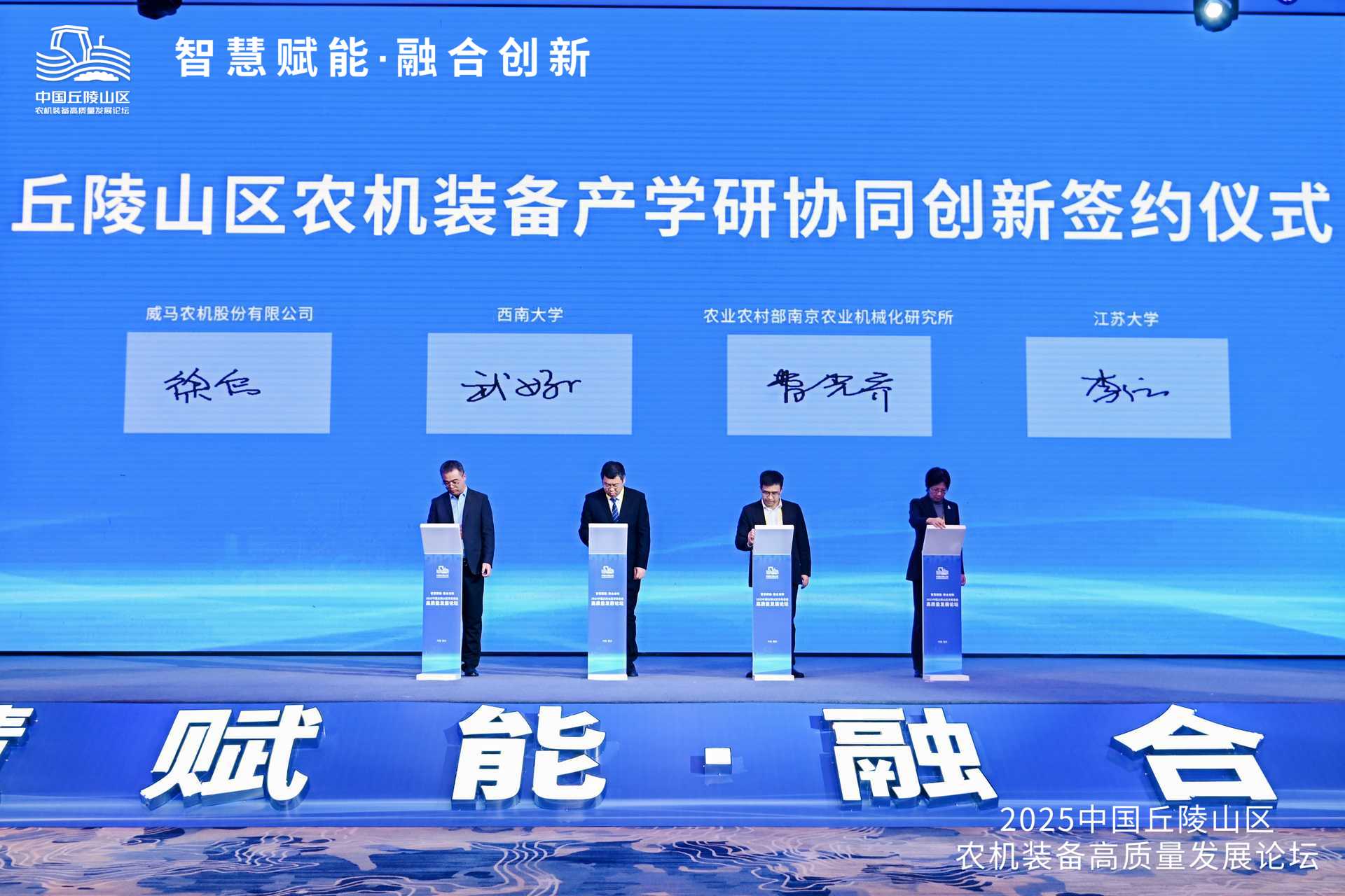 论坛期间同步举行多项签约,包括市经济信息委、市农业农村委与中国农机院进行三方签约仪式,将以“央地协同”方式推进农机装备产业高质量发展;中国农业机械流通协会进出口分会、越南中国总商会川渝企业联合会(北部企业)、重庆江津枢纽港产业园运营集团有限公司、华夏银行重庆分行举行农机装备跨境贸易协作签约,将围绕物流、商贸、金融等深化合作,共建农机装备出口渠道,带动更多“重庆造”农机产品“走出去”;农业农村部南京农业机械化研究所、江苏大学、西南大学、威马农机股份有限公司举行农机装备产学研协同创新签约,推动丘陵山区适用农机装备创新产品从实验室走向农业生产一线。