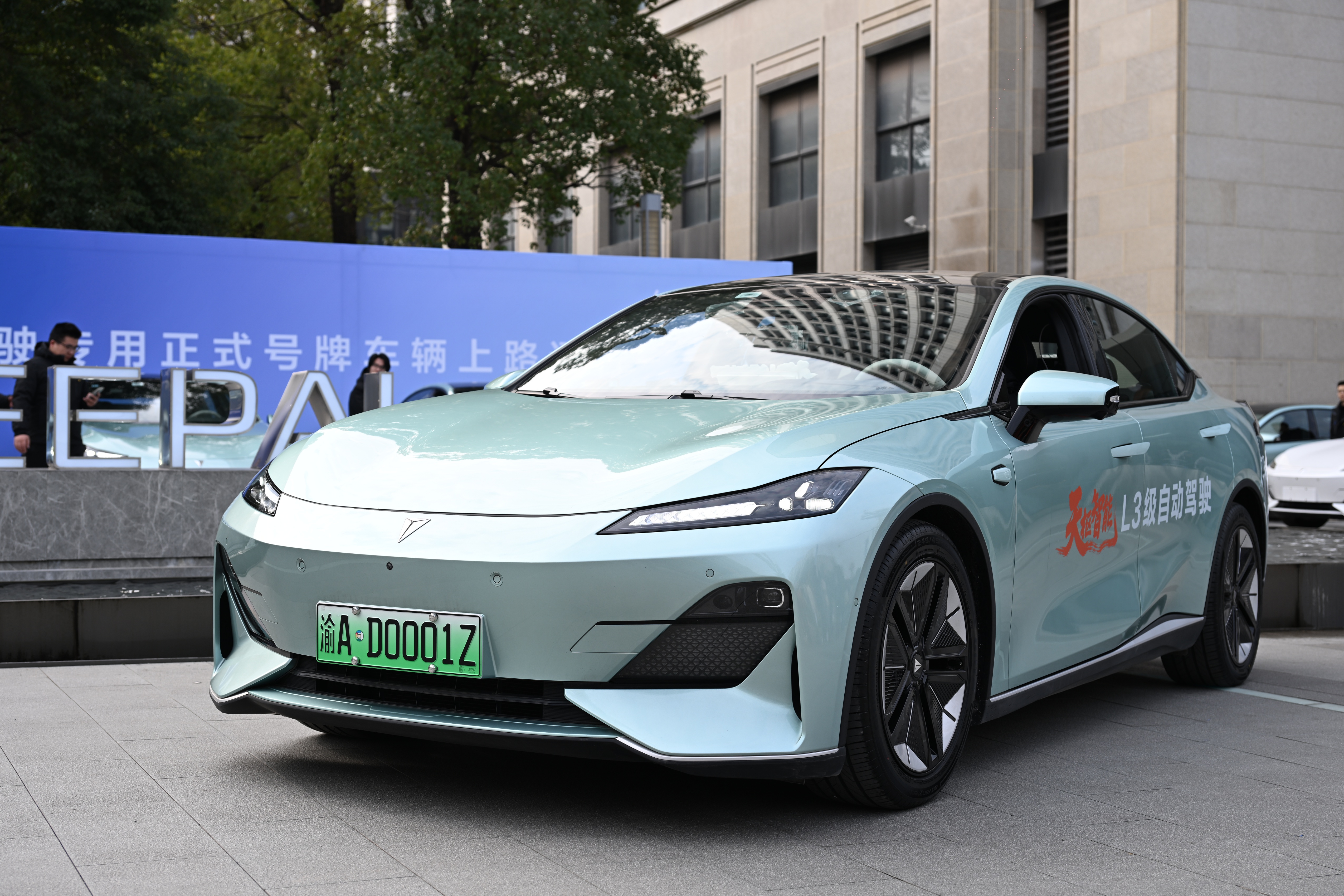 启动仪式现场,准备出发的深蓝SL03号牌呈现出独特的编码规则:首块号牌为“渝AD0001Z”,专用号段由“渝AD+四位数字+Z”组成。