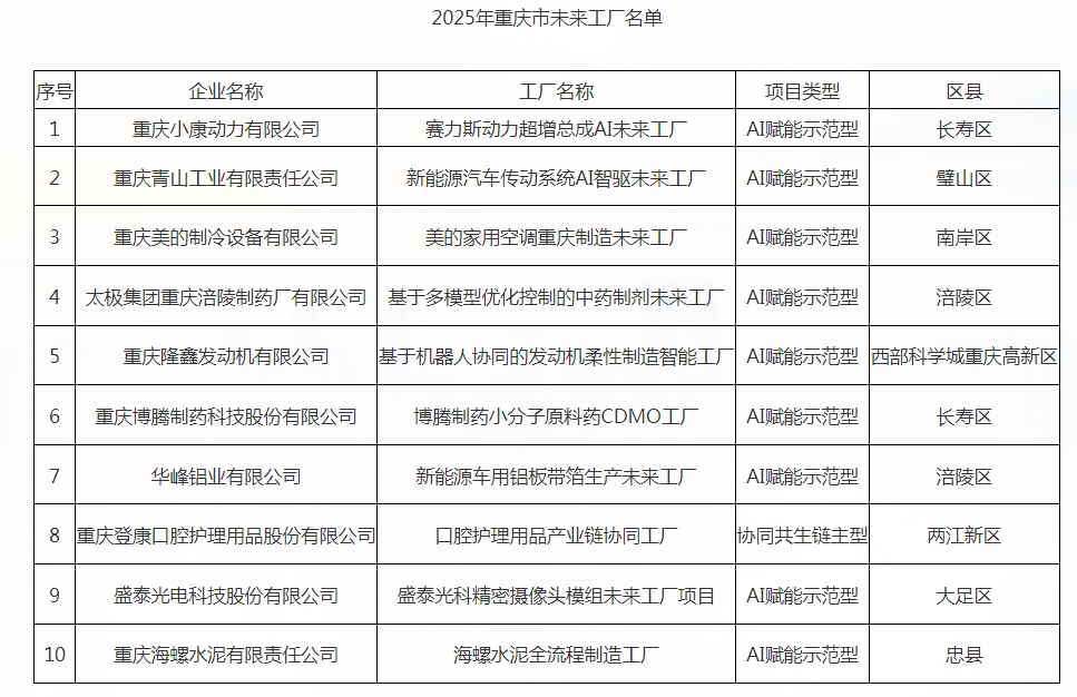 12月26日,市经济信息委公示2025年重庆市未来工厂名单,来自智能网联汽车、先进材料、生物医药等产业领域的10家企业工厂入选。