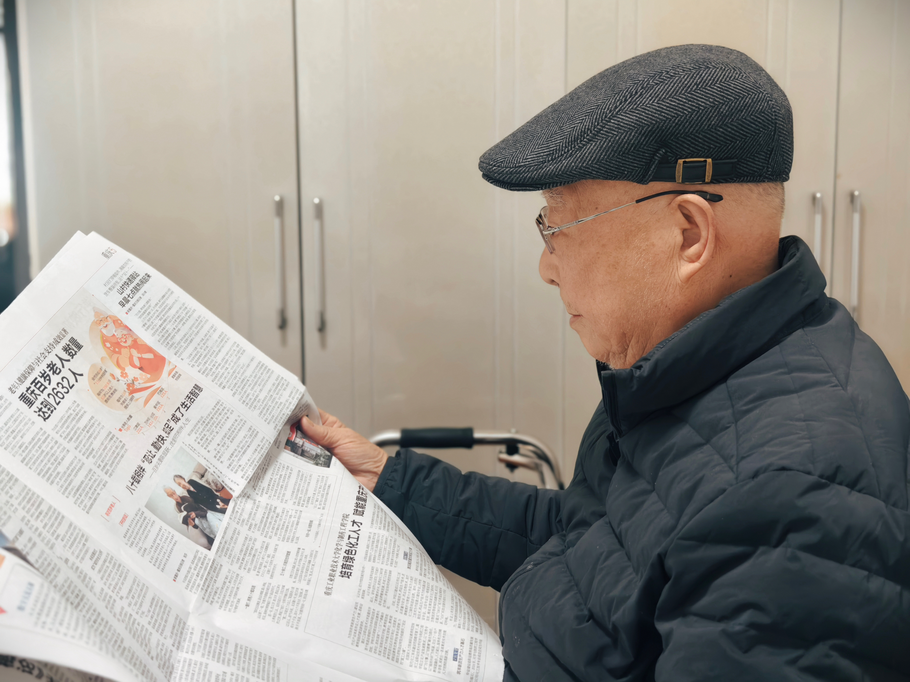 近日下午,阳光洒在九龙坡区一栋普通居民楼的客厅里。午睡刚醒,百岁老人沈建群坐在椅子上,手里拿着一份《重庆日报》,戴着眼镜逐字阅读新闻。