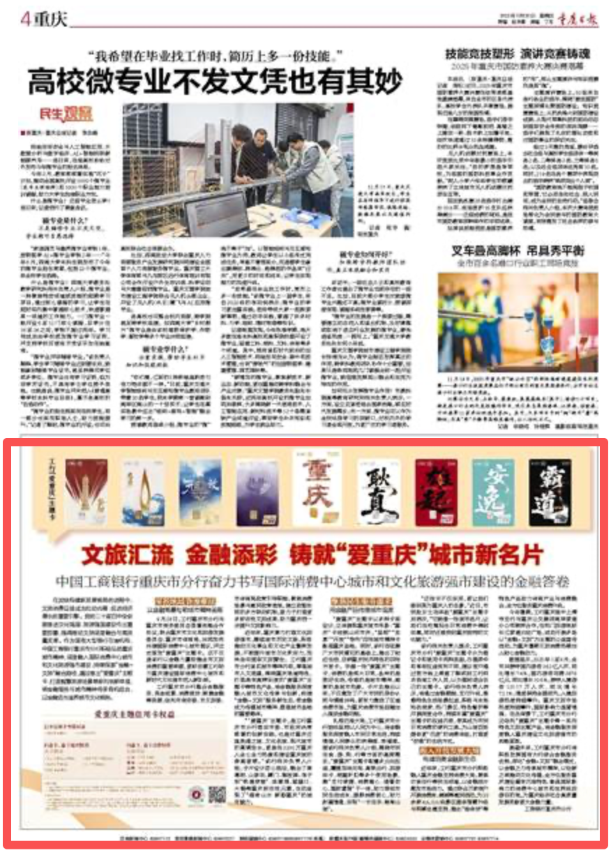 在加快构建新发展格局的进程中,文旅消费日益成为拉动内需、促进经济增长的重要引擎。党的二十届四中全会就推进文化强国、旅游强国建设作出重要部署,强调推动文旅深度融合与高质量发展。作为国有大型银行在渝机构,中国工商银行重庆市分行积极弘扬重庆城市精神,深度融入国际消费中心城市和文化旅游强市建设,持续探索“金融+文旅”融合路径,通过推出“爱重庆”主题卡、打造智慧旅游场景等系列创新举措,将金融服务与城市精神传承有机结合,以金融活水滋养城市文化根脉。