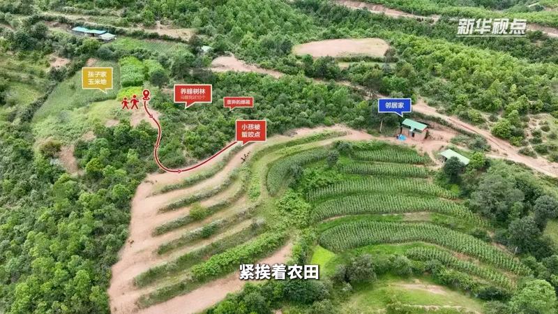 牟定县凤屯镇发生悲剧的养蜂场,紧挨着农田,且与一户村民家距离很近。