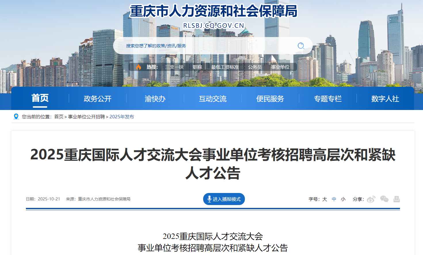 10月21日,重庆市人力资源和社会保障局发布《2025重庆国际人才交流大会事业单位考核招聘高层次和紧缺人才公告》(以下简称公告)。