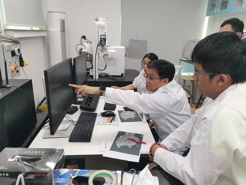 ▲2024年8月26日,徐义刚院士与团队成员通过扫描电镜观察嫦娥六号样品特征。(中国科学院广州地球化学研究所供图)