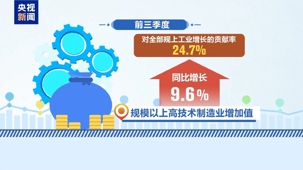 在高端化方面,前三季度,规模以上高技术制造业增加值同比增长9.6%,对全部规上工业增长的贡献率为24.7%,尤其是集成电路制造等行业增长快速。