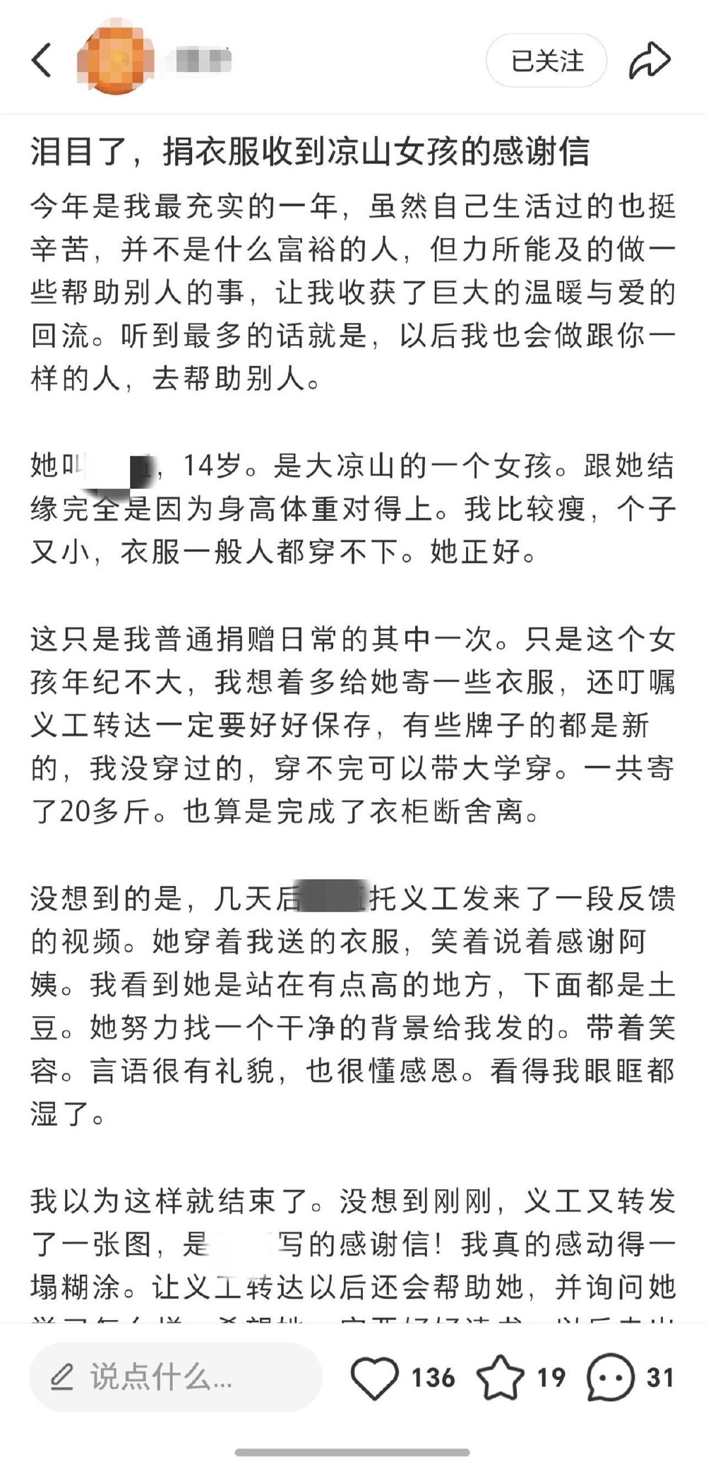 近日,有网友在社交平台上发帖称,她收到了一位14岁凉山女孩的感谢信,信中对她捐赠的衣服表示了感谢,虽然此前她也捐赠过多次衣服,但这是她第一次收到受捐者的亲笔信,让她不禁感叹:“让我收获了巨大的温暖与爱的回流。”