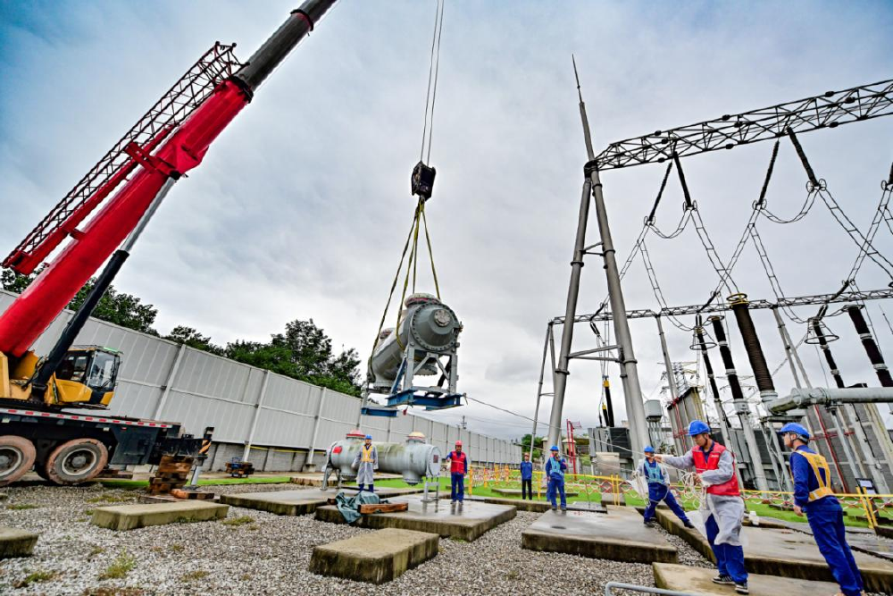 ▲国网重庆超高压公司员工在500千伏玉屏变电站起吊500千伏新GIS断路器。受访单位供图