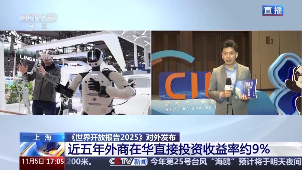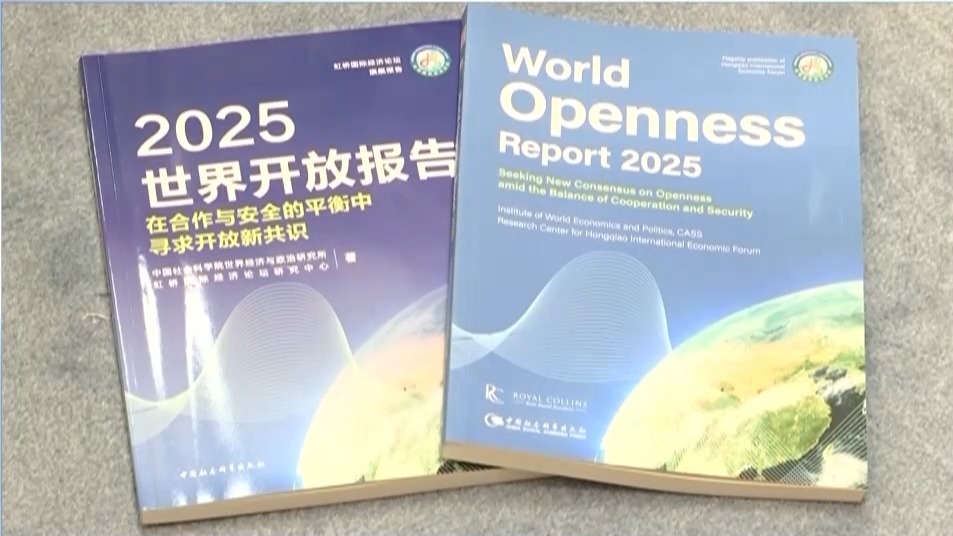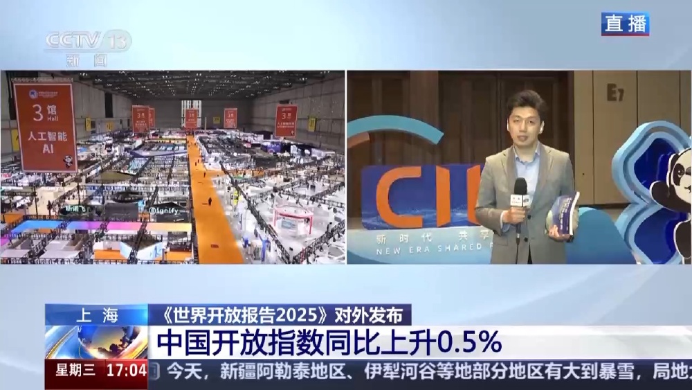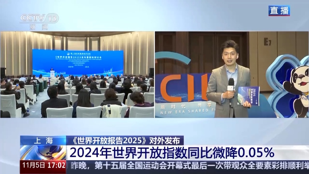 总台央视记者 郑怡哲:我现在手上拿的就是刚刚公布的《世界开放报告2025》,其中就包含最新世界开放指数等关键信息。今年的报告首次邀请了诺贝尔经济学奖获得者主持专章研究,同时与联合国工发组织专家合作制作而成,是一份更加权威、更加深入、更加国际化的《报告》。根据报告显示,目前,世界开放呈现出“总体收紧、分化加剧、动能转换”的格局。从整体上来讲,2024年,世界开放指数同比微降0.05%,较2019年下降0.34%,较2008年下降5.39%,所以说世界开放水平仍处于收缩的过程中。同时,不同地区的分化愈发清晰:像欧洲、北美地区,这些传统的开放引擎地区表现明显乏力,成为开放程度收缩严重的地区。相比之下,新兴市场和发展中经济体开放指数同比上升0.42%,成为维护世界开放的重要力量。