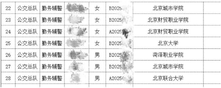 10月31日,“中安卫士北京”公众号公示了此次北京市公安局公交总队2025年11月份拟聘用勤务辅警名单,共计80人。红星新闻记者从这份拟聘用人员名单中看到,院校信息包括了北京大学、中国科学院大学、中国政法大学等高校。