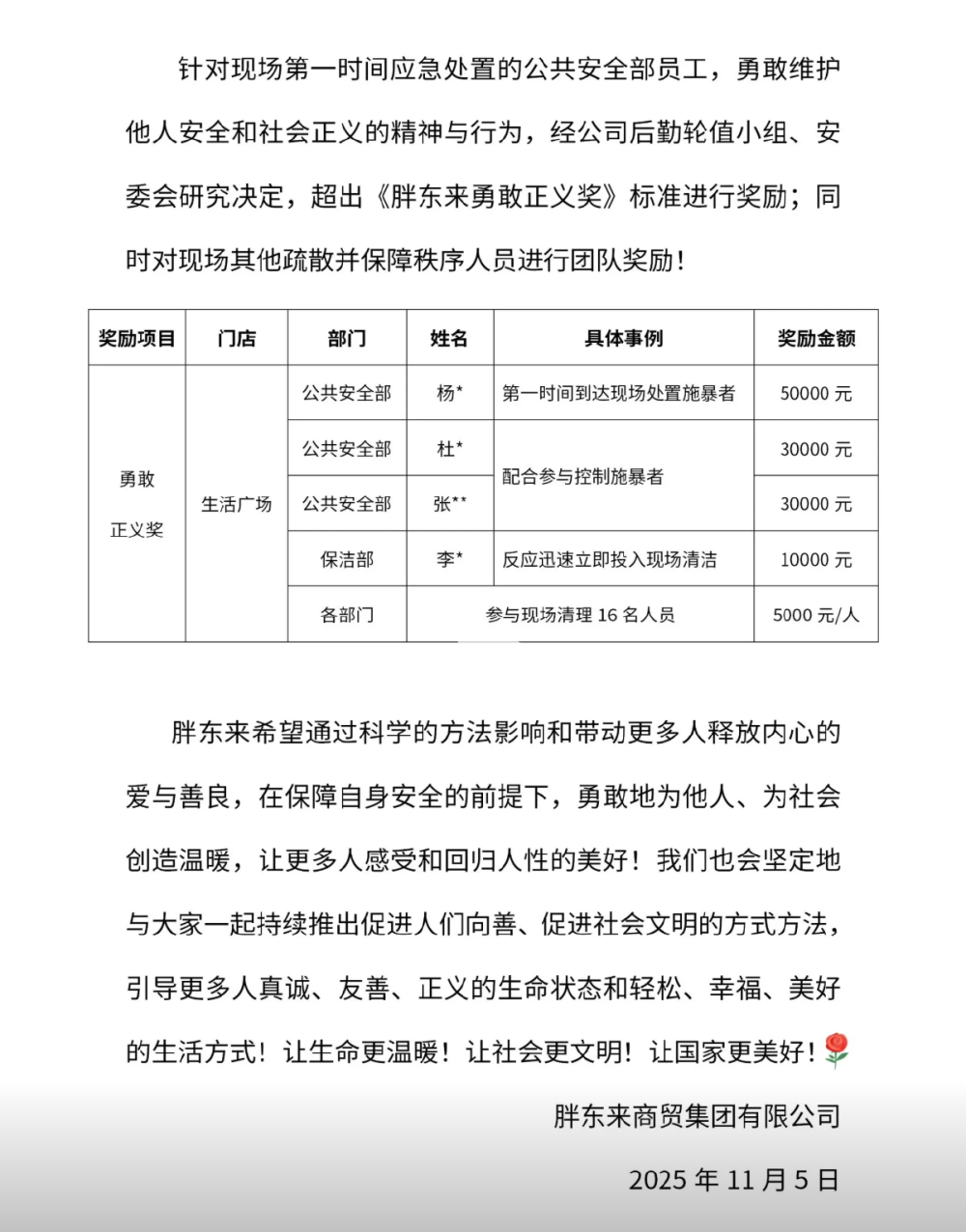 11月5日晚,河南许昌胖东来超市有限公司官方抖音账号发布关于胖东来员工勇敢正义奖励公示,据公示信息,公司对于参与11月2日生活广场突发故意伤害事件应急处置的员工进行奖励,给予20名员工共计20万元奖励,其中给予第一时间到达现场处置施暴者的公共安全部员工杨某5万元奖励,配合参与控制施暴者的两人3万元奖励,反应迅速立即投入现场清洁的一人1万元奖励,此外,参与现场清理的16名人员每人奖励5千元。