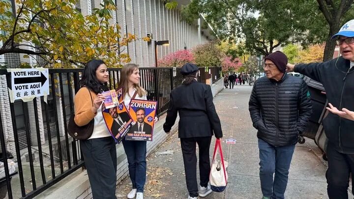 ▲11月4日,支持者在美国纽约一个投票站外手持候选人祖赫兰·马姆达尼的竞选海报(手机拍摄)。新华社发(周焕新摄)