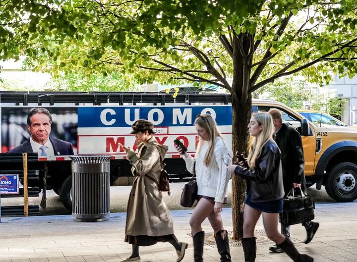 ▲11月4日,在美国纽约,行人经过候选人安德鲁·科莫的竞选海报。新华社发(章正浩摄)
