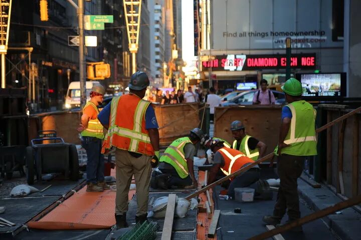 ▲6月24日,建筑工人在美国纽约曼哈顿街头工作。新华社记者刘亚南摄