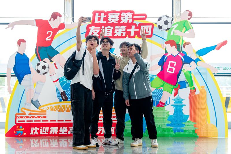 ▲11月1日,赴南京观看苏超决赛的球迷在江苏泰州站合影。新华社发(杨玉岗摄)