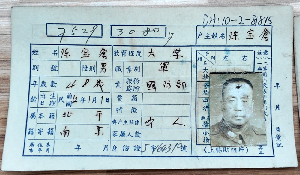 此次公开的户籍卡均形成于1946年至1948年间,属南京解放前夕户籍登记档案。记者看到,吴石的户籍卡明确标注其当时50岁,“服务处所”为“国防部史料局”,“业别”为“局长”,住址登记为“湖北路翠琅村1号”;陈宝仓的户籍卡显示其48岁,“服务处所”为“国防部”,住所为“丰富路342号”;聂曦的户籍卡详细记录了其年龄29岁,“服务处所”为“国防部史料局”,住所在“炮标”。3张户籍卡均粘贴有当年的照片,成为还原英烈隐秘岁月的直观物证。