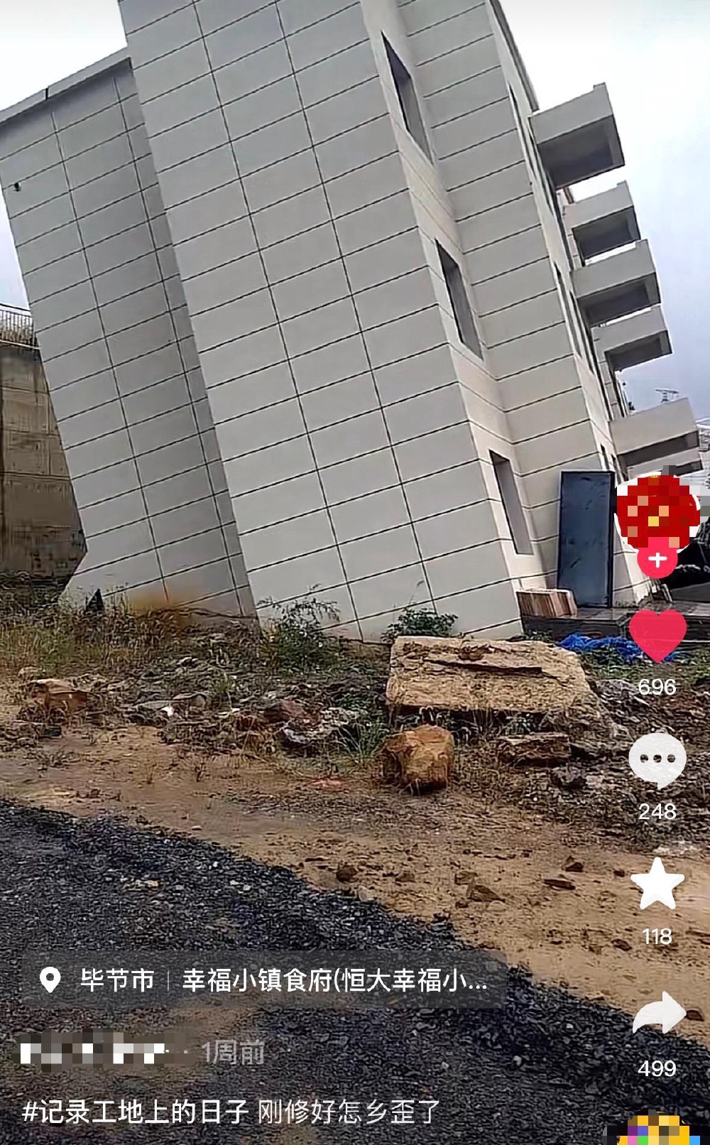 视频中,一栋数层高的建筑物倾斜于地面,发布者表示:“刚修好,怎么歪了?”