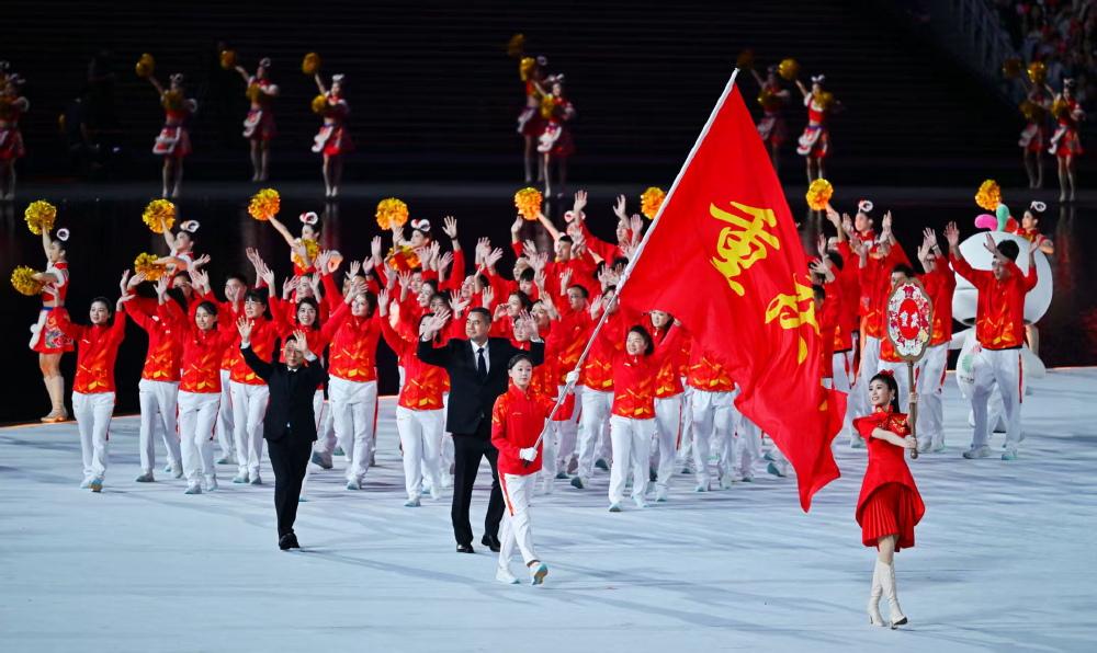 今(9)日晚,第十五届全运会开幕式在广东省奥体中心体育场举办。在热烈的氛围中,重庆市体育代表团迈着整齐而坚定的步伐入场。引领重庆代表团入场的旗手,是巴黎奥运会艺术体操集体全能冠军丁欣怡。