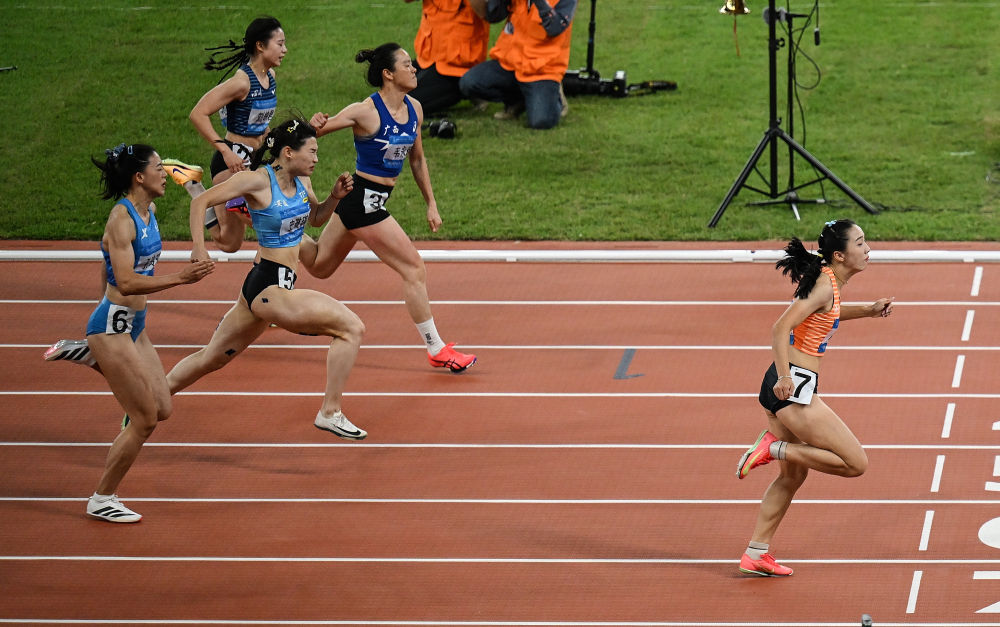▲11月17日,浙江队选手陈妤颉(右)在田径女子100米决赛中率先冲线。新华社记者 周牧 摄