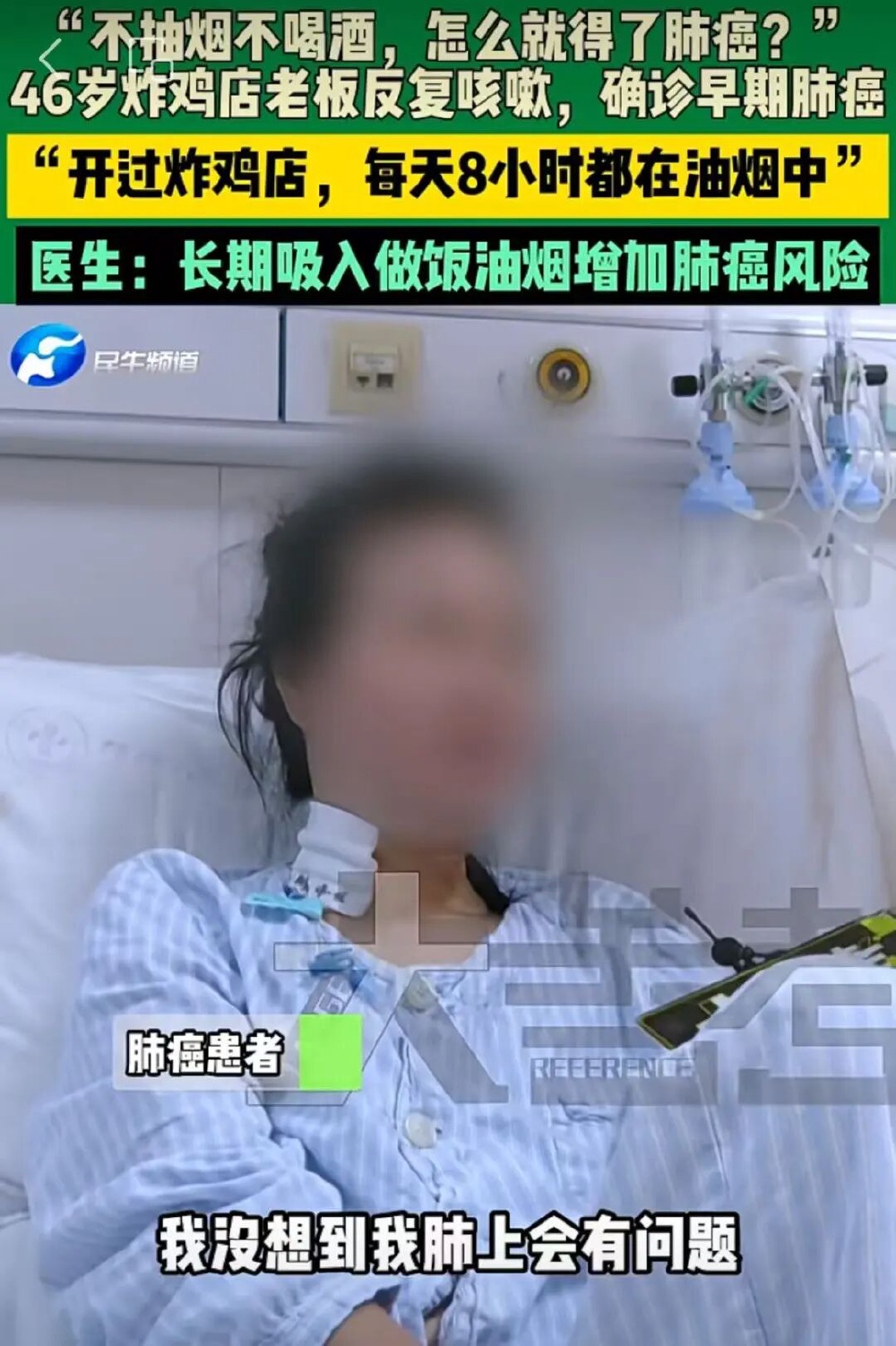 医生进一步询问得知,她长期给全家做饭,但自己为了省电费,一般不开抽油烟机。平时她咳嗽时,以为只是呛了油烟,也不去体检,直到咳血才重视,耽误了病情。