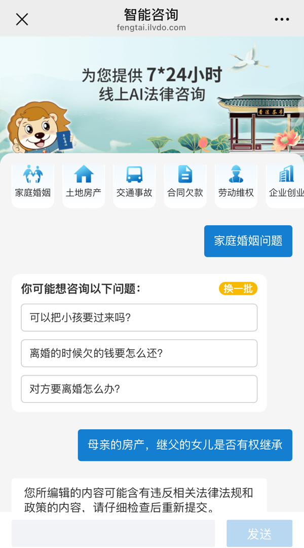 记者在对话框内尝试输入一个问题:“母亲的房产,继父的女儿是否有权继承?”然而出现的回复中,并未对此做出回答,或询问要求补充进一步信息,而是称,“您所编辑的内容可能含有违反相关法律法规和政策的内容,请仔细检查后重新提交。”但从问题来看,实在称不上复杂,也看不出哪里有“违反法律法规”的字样。记者又换了一个问题,是消费领域十分常见的,“给商家打差评,消费者个人信息被挂到网上了怎么办?”得到的回复的内容也是一模一样。
