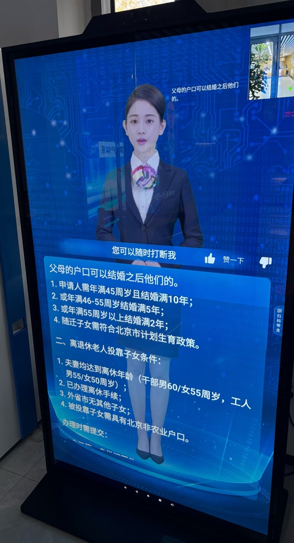 摄像头识别到有人接近,该“数字人”发出“可以站在正前方进行语音交流”的提示。“企业注册流程”“独生子女一次性奖励政策”,记者尝试说出几个单一词条,对方均能迅速给出语音回复,屏幕上同时滚动显示相应政策条款。但当咨询稍复杂些的问题时,“数字人”便显得有些力不从心了。