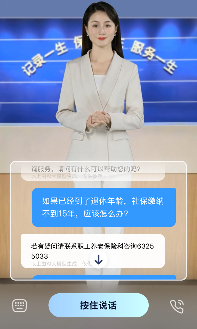 与之类似,记者使用某区社保局推出的网络互动“数字人”,向其咨询“已经到了退休年龄,社保缴纳不满15年应该怎么办?”对于这一基础问题,对方也是无法作答,只能给出职工养老保险科的电话,请提问者致电咨询。