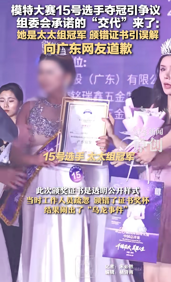 11月19日,大赛组委会副主席罗云琦告诉红星新闻记者,“15号选手是太太组冠军,比赛还设置儿童组和男模特组,女模特组广东冠军实际是37号女模特,此次颁奖证书是透明公开样式,当时工作人员疏忽,颁错了证书奖杯,结果闹出了‘乌龙事件’。”