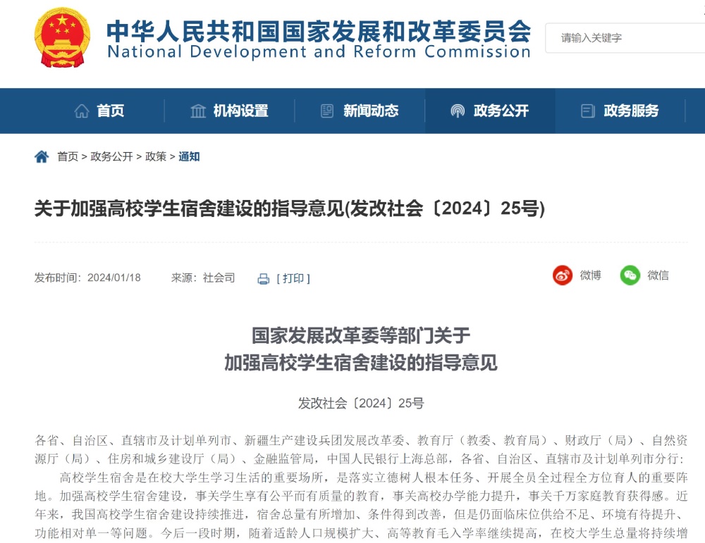 2024年1月,国家发展改革委、教育部、财政部、住建部等七部门发布《关于加强高校学生宿舍建设的指导意见》,支持宿舍面积缺口大、具备新建条件的高校新建一批学生宿舍。同时,鼓励高校通过购买、租赁学校周边的人才公寓、商住楼等社会用房,补充宿舍资源,并按照校内同等标准,加强配套服务管理。