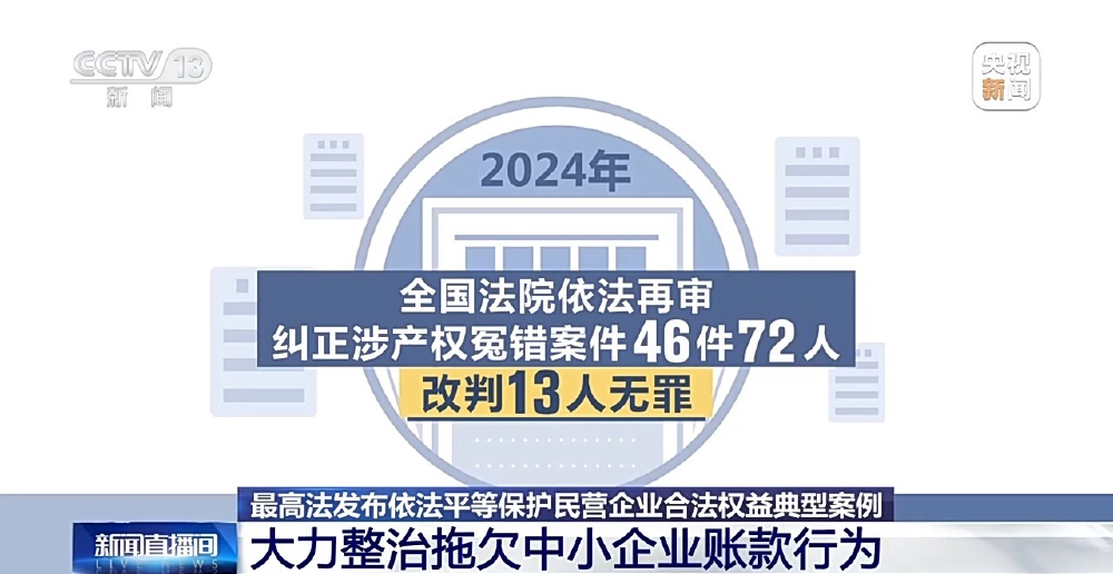 最高法表示,严格区分合同纠纷与合同诈骗、正当融资与非法集资等罪与非罪的界限。对历史形成的涉企冤错案件,建立常态化甄别纠正机制。2024年全国法院依法再审纠正涉产权冤错案件46件72人,改判13人无罪。