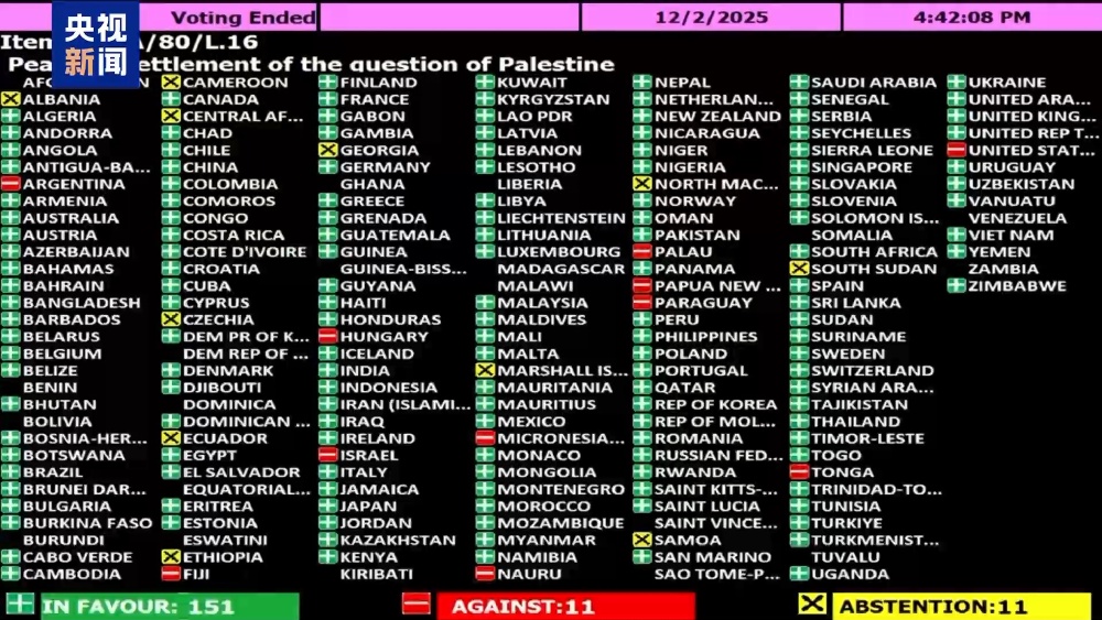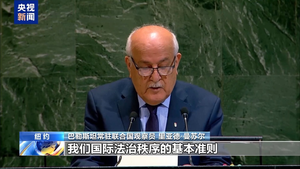 巴勒斯坦常驻联合国观察员 里亚德·曼苏尔:这项具有里程碑意义、奠定框架的决议在这一关键时刻出台,当下有必要重申支撑我们国际法治秩序的基本准则,并明确落实这些准则所需的方式。在巴勒斯坦问题上,这些准则必须成为实现公正、持久和平的指南。
