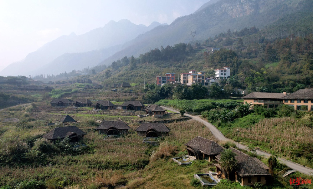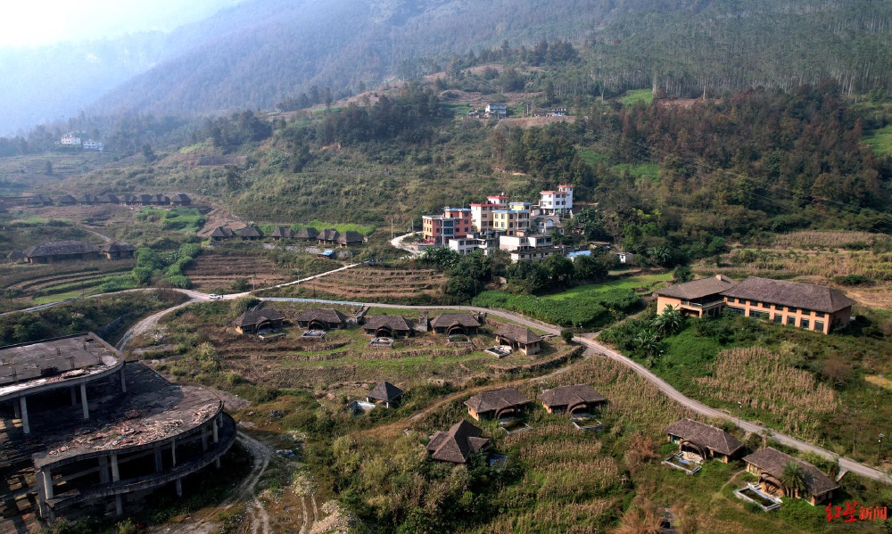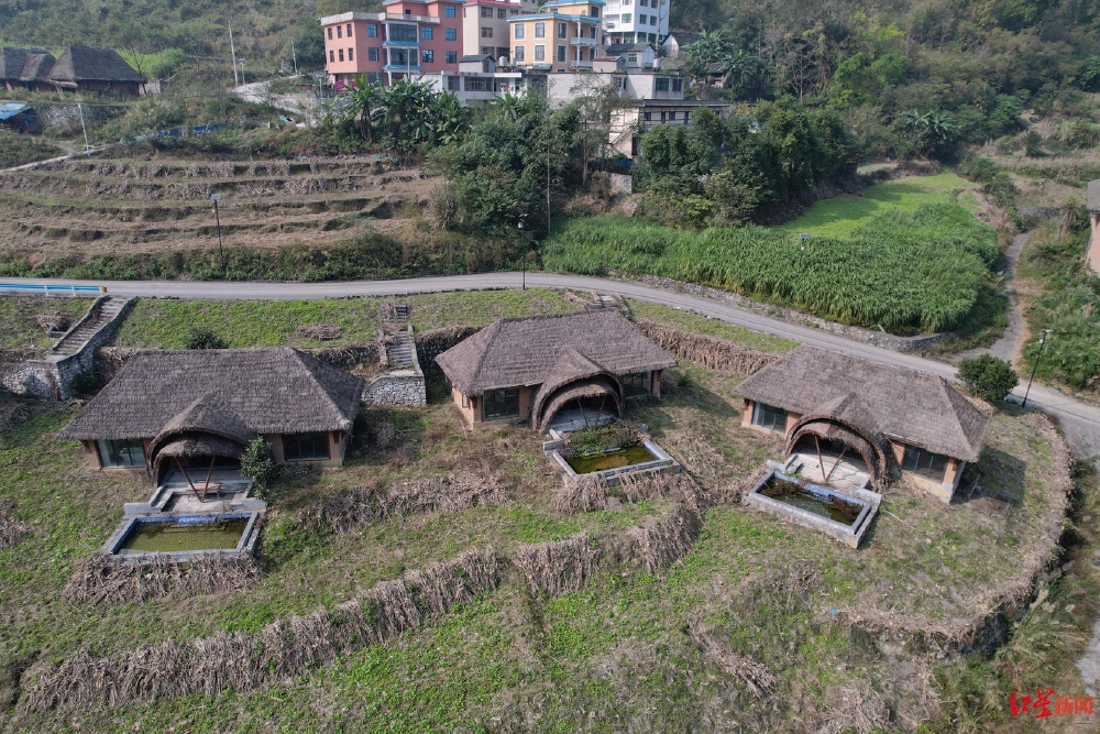“稻田酒店”位于村里的河谷旁。12月1日,红星新闻记者来到现场发现,数十栋建筑错落分布,周围有梯田、民房等。其中大部分建筑已成型,完成了内部基装,另有部分建筑未完工。这些建筑设计别致,屋顶铺有茅草,不少房屋前还建有水池。但由于长时间无人打理,房屋周围杂草丛生,外墙及内部部分设施或装饰有破损。