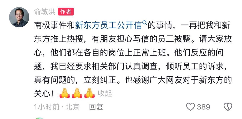 12月6日,俞敏洪对此事件进行回应:南极事件和新东方员工公开信的事情,一再把我和新东方推上热搜,有朋友担心写信的员工被整。请大家放心,他们都在各自的岗位上正常上班。他们反映的问题,我已经要求相关部门认真调查,倾听员工的诉求,真有问题的,立刻纠正。也感谢广大网友对于新东方的关心!